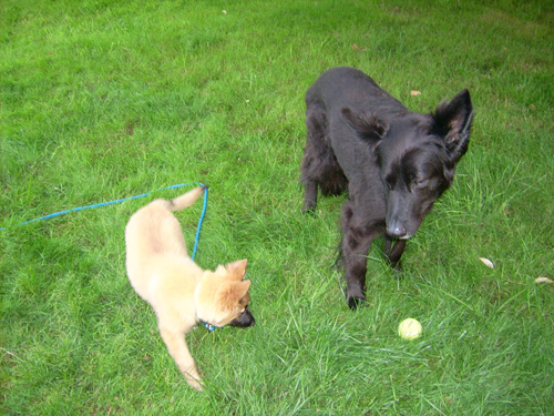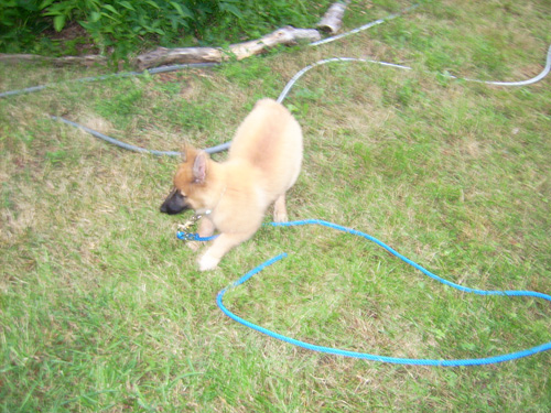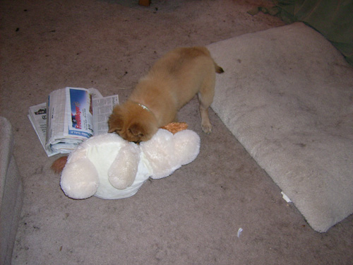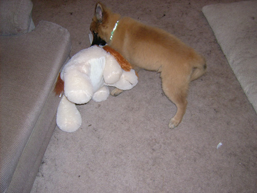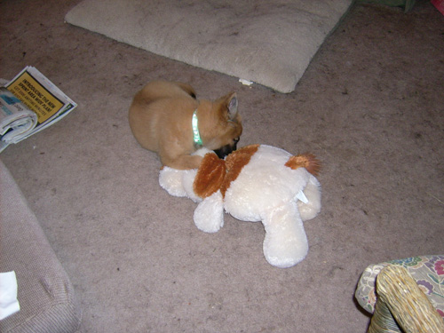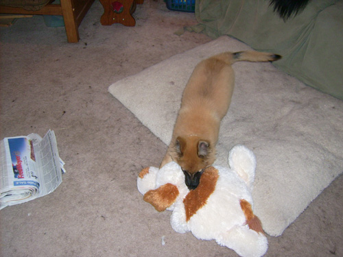 I kept trying to substitute her new bite toys. I'll have to also try a NOISY plastic bottle. Man she plays rough. I like that. I always like dogs that would play rough. Kylie will wrestle with me. It always amazes me because she'll grab my legs with her legs/paws, but her bite is so gentle. Not puppy. OUCH!